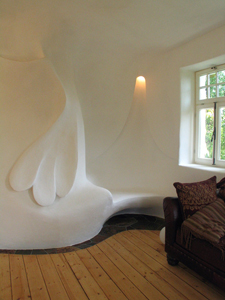 befreundeten Handwerkern (insbesondere mit Leif Erik Voss) um. So beschäftigten sich die Gestaltungen von KARAMULIS im Haus denn auch insbesondere mit den dort wahrgenommenen Lichtkräften, wie auch dem Entlassen von alten belastenden Stimmungen in einzelnen Räumlichkeiten - den "Spinnweben“ früherer Zeiten.Eine geschwungen erweiterte Diele, ein