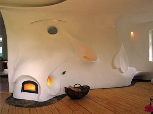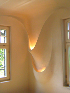 KARAMULIS übernahm zusätzlich die Konkretisierung und Ausführung der von der Architektin entworfenen Gewölbeausbildung des Schlafzimmers im Dachgeschoss, sowie Entwurf und Ausführung mehrerer künstlerisch gestalteter Lichtquellen und Details im Haus. Der Eingangsbereich des Hauses ist nun durch die zurückversetzte, warme und geschwungene Rückwand des Ofens einladender und weiter.