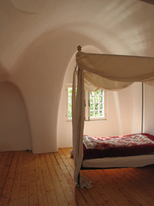 Schlafzimmer mit Gewölbedecke. Zwei parabelförmige Nischen ließen den